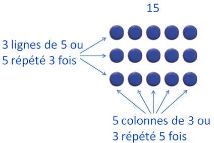 D'ailleurs, on peut dire "3 fois 5", "3 paquets de 5", "3 lignes de 5" ou "5 multiplié par 3", "5 répété 3 fois".