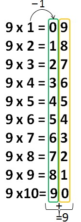 Pour te souvenir comment on reconstitue le résultat, tu peux revoir les unités de la dernière ligne compléter les autres lignes. Ou par exemple tu peux t’imaginer que le neuf assomme le chiffre à multiplier, et alors celui-ci se casse en 2 : une partie avec 1 de moins et l’autre avec le complément à 9.