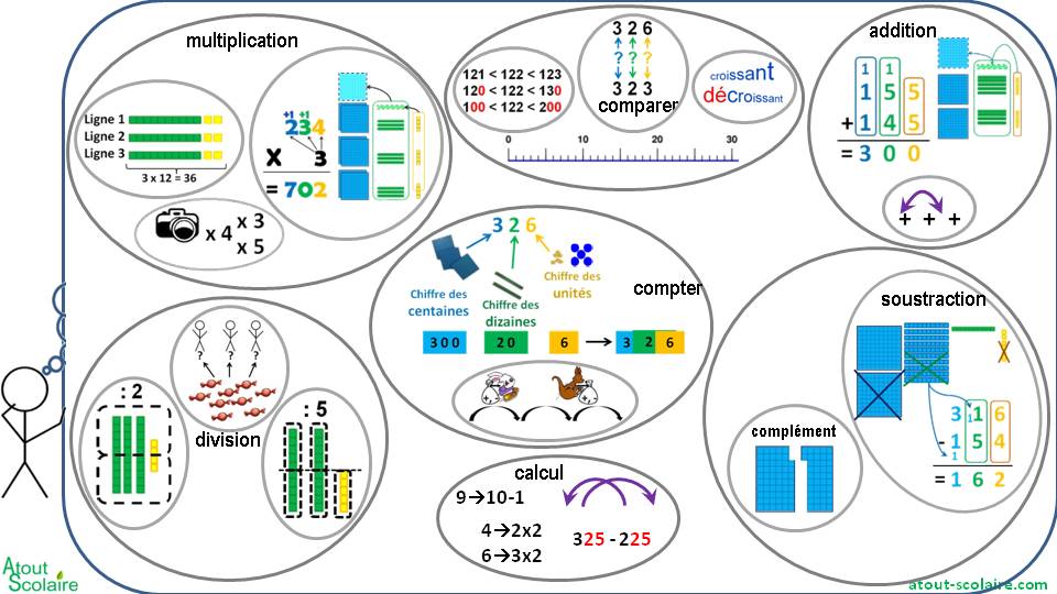 Dans ce niveau tu as complété tes connaissances sur plusieurs thèmes en les revoyant pour des nombres plus grands (à 3 chiffres) :