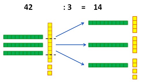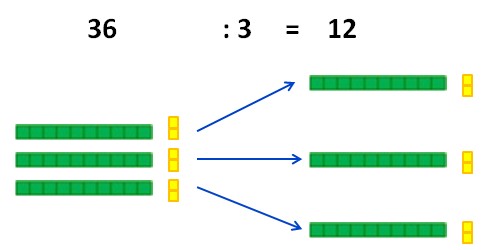 Par exemple calculons 36 : 3. On répartit en 3 paquets égaux, donc chaque paquet aura 1 dizaine et 2 unités, donc 36 : 3 = 12.