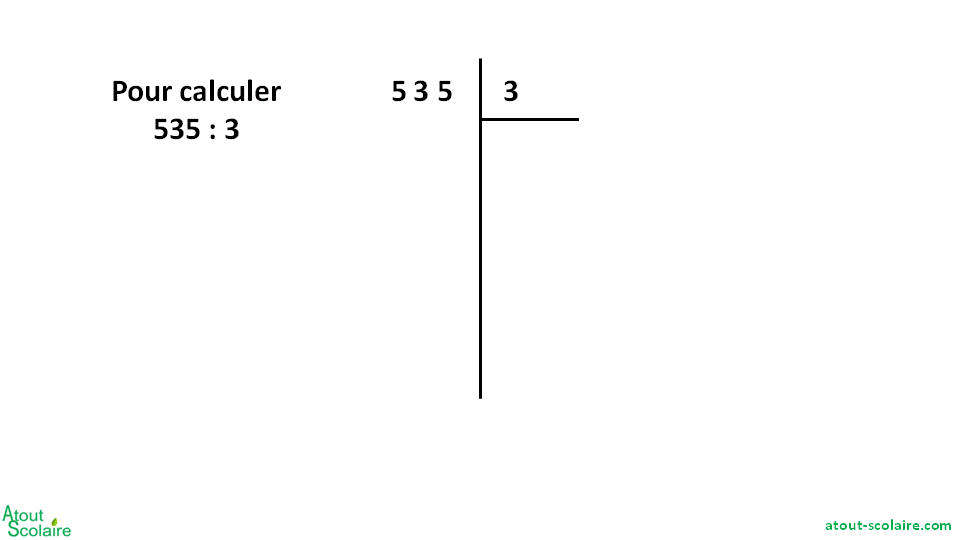 Pour poser la division, il ne reste plus qu’à faire pareil mais en l’écrivant. Pour la division, on se sert d’un tableau différent que pour les autres opérations. Cette nouvelle présentation permet de bien voir tout ce qu’il reste à répartir à chaque étape :
