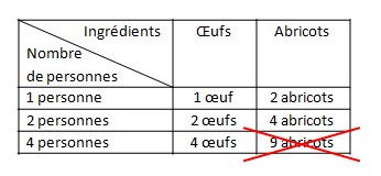 - il faut multiplier toute la colonne « Abricots » par 2 par rapport à la colonne personnes, donc pour 4 personnes, on devrait avoir 4 x 2 = 8 abricots.