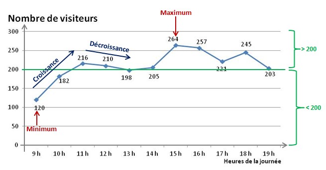 On voit aussi facilement à quelles heures il y a plus de 200 visiteurs, ou moins.