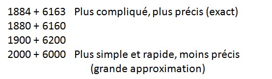 On pouvait simplifier encore plus en utilisant des approximations au millier près : 10.000 + 4000 = 14000, mais plus l’approximation est grande (plus on simplifie), plus l’estimation s’éloigne du résultat exact.