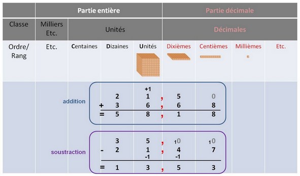 Pour la soustraction et la division : si je n'ai pas assez d'éléments, je transforme un plus gros en 10 plus petits.