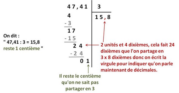 On procède toujours pareil. Il faut juste penser à écrire la virgule pour indiquer lorsque l'on passe aux décimaux.