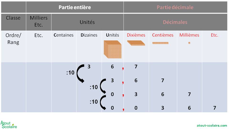 A l'inverse, diviser par 10 transforme les dizaines en unités, les unités en dixièmes etc..