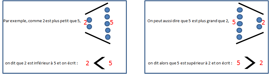 En mathématiques, quand on veut dire qu'une valeur (un nombre) est plus petite ou plus grande qu'une autre, on utilise les signes < et >
