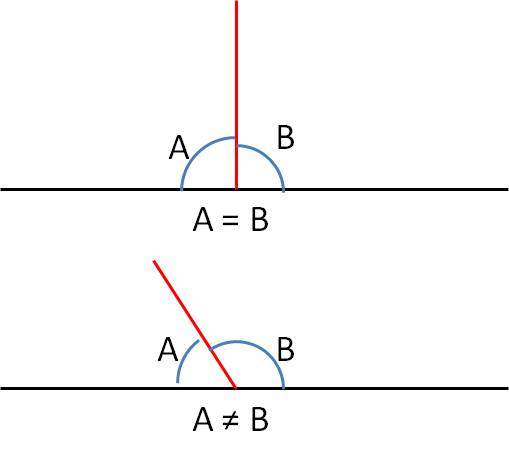 Tu peux aussi remarquer que la perpendiculaire coupe la droite en deux angles égaux (tous les deux des angles droits, bien sûr). C'est pour cela que tous les murs sont perpendiculaires au sol, sinon ils pencheraient et pourraient tomber ! |