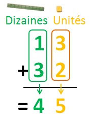 Pour cela, on écrit les deux nombres à additionner l'un en-dessous de l'autre, en alignant bien les dizaines entre elle, et les unités entre elles.