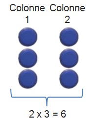 Par exemple si j'ai 3 pions, et que je veux les multiplier par 2, je fais 2 colonnes de 3 pions. Je vois alors tout de suite qu'au total, j'en ai 6.