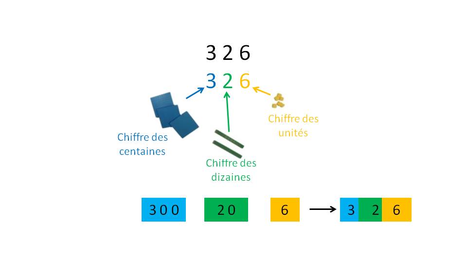 Par exemple, le nombre 326 est composé de 3 centaines, 2 dizaines et 6 unités.