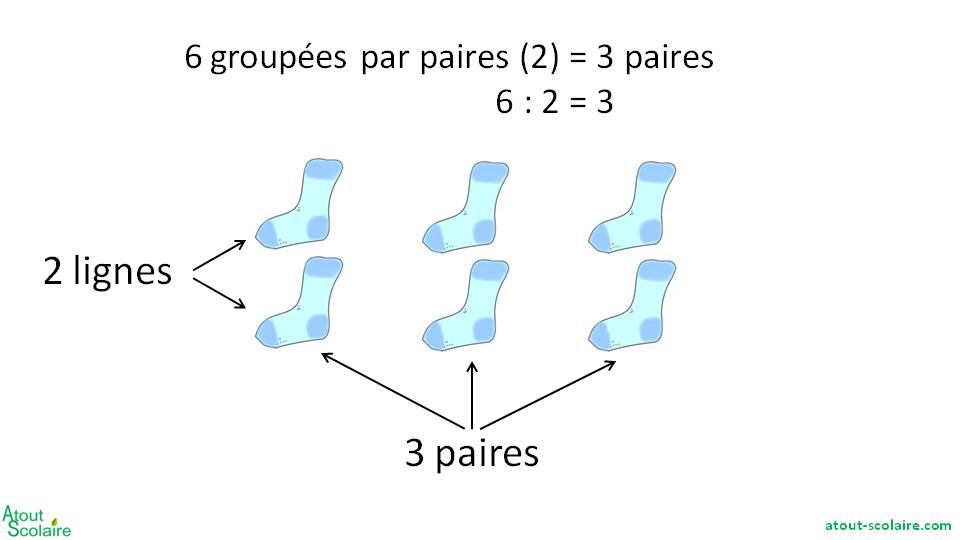 Par exemple 10:2=5 car lorsque je répartis 10 pions en 2 paquets, je sais que j'ai 5 pions dans chaque paquet.