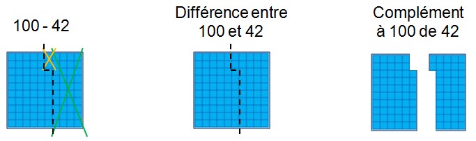 Exemple avec le complément à 100 de 42 : il faut 8 unités pour compléter les 2 unités en une dizaine entière, puis je dois encore ajouter 5 autres dizaines pour obtenir une centaine complète. Donc au total, j'ai complété avec 58.