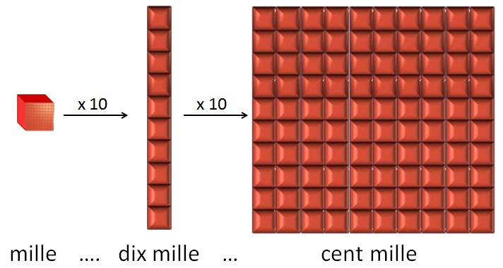 Après 999, on obtient 10 centaines complètes, et cela forme un gros cube de mille (1000) unités, appelé "un millier".